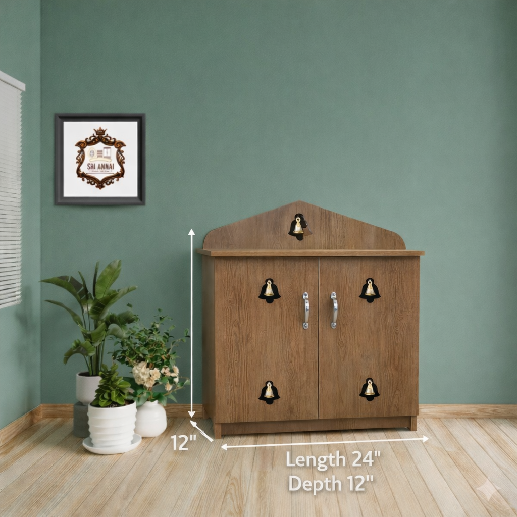 A wooden pooja rack is a specially designed shelf or cupboard used for organizing and displaying idols, incense, lamps, and other essential items used in daily worship rituals at home. These pooja racks are traditionally crafted from various types of wood such as pine, teak, plywood, or engineered wood and can have intricate carvings or a simple, minimalist design depending on taste and home decor. They typically feature multiple shelves or compartments for arranging pooja items neatly and may have doors or be open shelves.