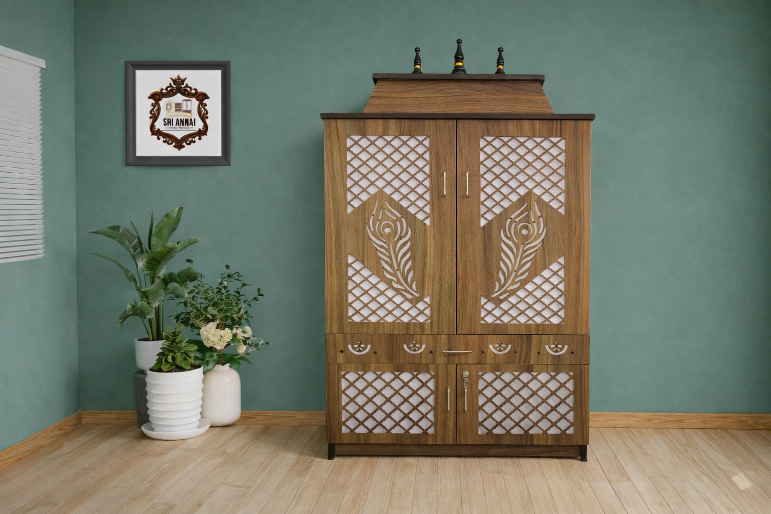 Designed to blend functionality with elegant craftsmanship, suitable for compact home pooja rooms or temples.