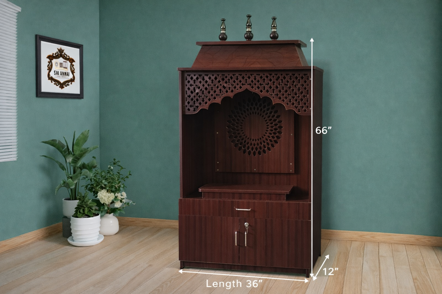 Light Wood: Crafted from light-colored wood such as pine, maple, or engineered wood with a light laminate or natural varnish, providing a bright and elegant look suitable for modern pooja rooms.
